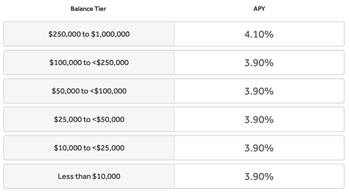 Listed here are the present rate of interest tiers, as of 10/19/25. Observe that it’s principally a 3.90% APY account except you’ve a $250,000 stability. As with all financial savings accounts, the charges are additionally topic to alter at any time.