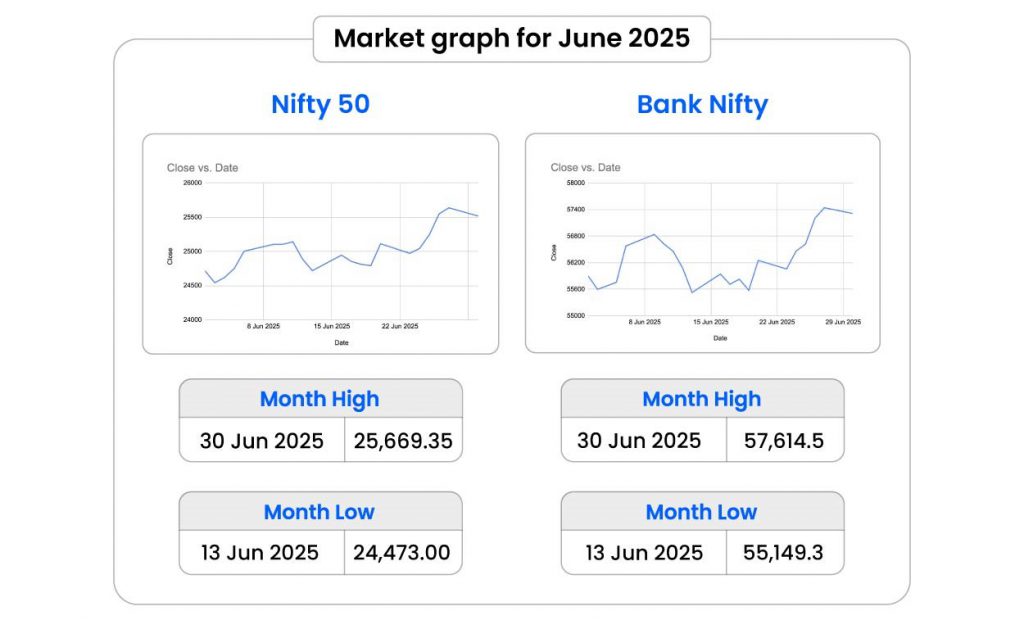 The Nifty50 rose 3.1% (766 factors) in June 2025, marking its fourth straight month-to-month achieve, whereas the Financial institution Nifty touched a brand new lifetime excessive of 57,614 and ended with a 2.8% (1563 factors) rise, additionally its fourth consecutive month-to-month advance. The rally was pushed by a number of components because the RBI reduce the repo price by 50 foundation factors to five.50% and decreased the CRR by 100 foundation factors to spice up liquidity, whereas shifting to a impartial coverage stance amid managed inflation.