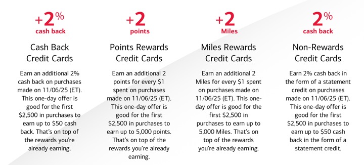 Again for 2025. Financial institution of America has a one-day bank card promotion referred to as “Extra Rewards Day” on Thursday, 11/6/25. Relying in your BofA bank card sort (each shopper and enterprise playing cards are all eligible), you possibly can earn an extra 2% money again or 2 factors or miles/$1 spent on as much as $2,500 in purchases made on 11/6/25 solely (Japanese time zone!), as much as a $50/5,000 level cap per distinctive bank card account. That’s on on high of the rewards you’re already incomes. No enrollment required.