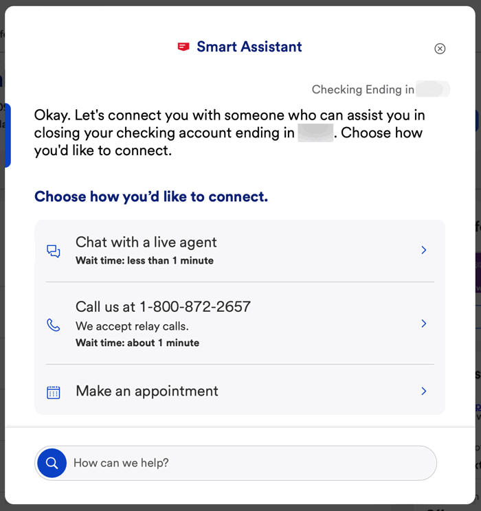After US Financial institution utterly modified the phrases of their Neatly Rewards bank card lower than 6 months after software, I’ve almost accomplished closing almost all of my US Financial institution accounts, together with financial institution accounts, bank cards, and brokerage accounts. The method was comparatively easy, and also you don’t want to go to a department or name them on the telephone for those who don’t need to. You may shut your account on-line utilizing the Reside Chat function on their web site. Merely kind in “shut account” into their Sensible Assistant search bar, after which they are going to ask which account you need to shut. After you choose it, you can be offered with the next popup choices. These could also be totally different primarily based on their daytime/weekday enterprise hours, however I used to be in a position to attain somebody in lower than a minute. The Reside Chat agent closed issues effectively whereas I did different stuff on my laptop.