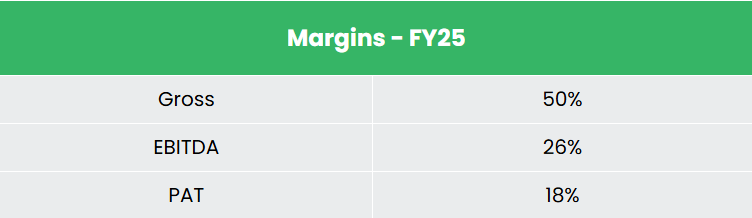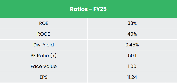 - Monetary Efficiency – The three-year income and internet revenue CAGR stands at 33% and 46% respectively between FY23-25. The corporate has a strong capital construction with a debt-to-equity ratio of 0.03. Common 3-year ROE and ROCE is round 28% and 37% for FY23-25 interval.